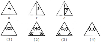 Directions to SolveEach of the following questions consists of a set of three figures X, Y and Z showing a sequence of folding of apiece of paper. Figure (Z) shows the manner in which the folded paper has been cut. These three figures are followed by four answer figures from which you have to choose a figure which would most closely resemble the unfolded form of figure (Z).
